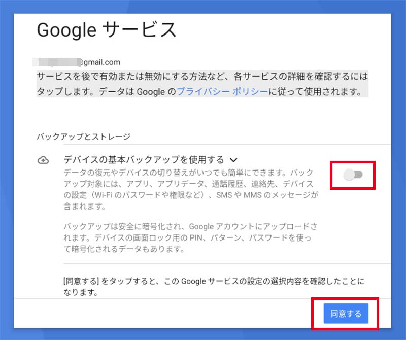 途中Googleアカウントでの設定が色々出てきますが、基本的にキャンセルやオフでOKです。