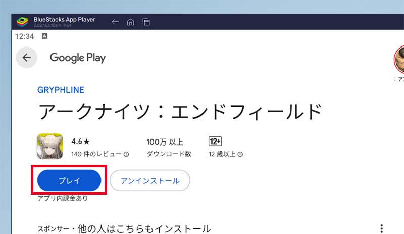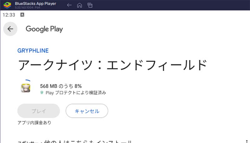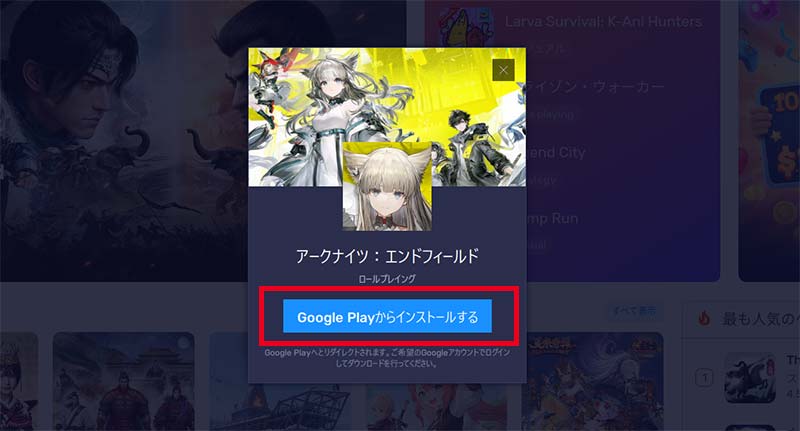 アークナイツ:エンドフィールドの「インストール」をクリックすると、GooglePlayストアからゲームデータがPCにダウンロードされます。