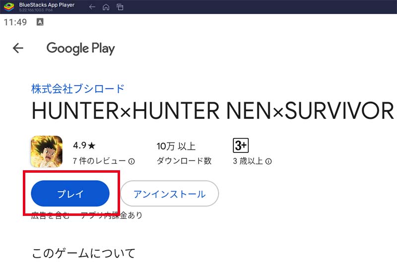 インストールが終わったら「プレイ」ボタンを押して、さっそくHUNTER×HUNTER ネンサバを始めましょう!