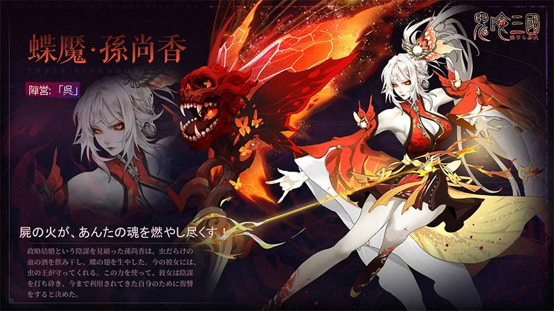 鬼喰三国:滅びし蒼天には、呂布、関羽、諸葛亮、趙雲、孫尚香など、三国志でおなじみの武将たちがダークファンタジー風にアレンジされて登場します。